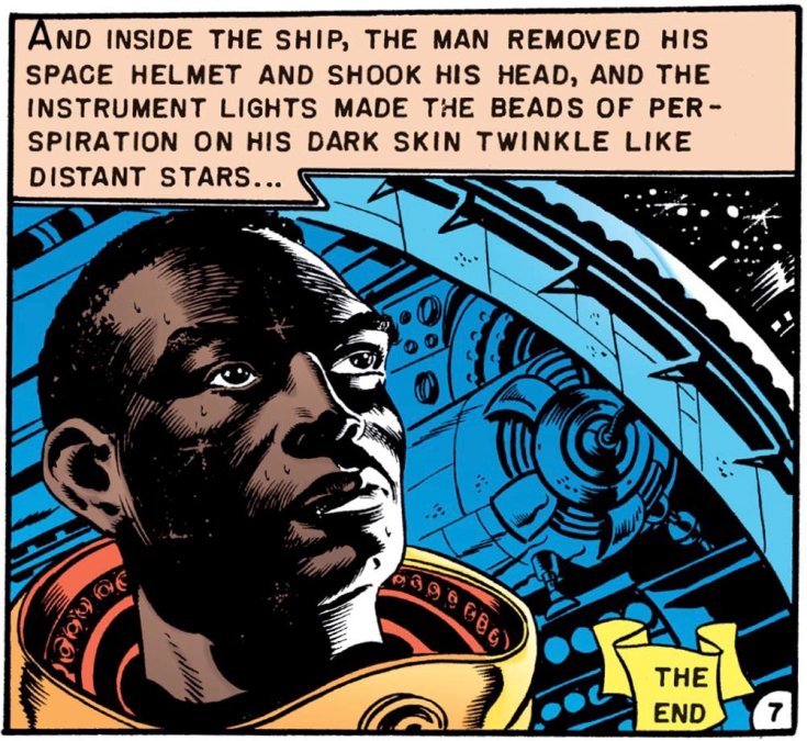 Ainsi, dans In Gratitude… publié dans Shock Suspenstories #11 (1953), le récit raconte le retour du front de la Guerre de Corée d’un soldat américain, Joey Norris, accueilli en héros dans sa ville natale. Alors que celle-ci se prépare aux festivités, le jeune héros de guerre, qui a perdu une de ses mains au combat, demande à ses parents de pouvoir aller rendre hommage à Hank, son camarade tué au combat, qui lui a sauvé la vie. N’ayant pas de parents, Joey a demandé que son ami soit enterré dans le cimetière familial. Mais, les parents de Joey lui avouent honteusement que sous la pression des habitants de la ville, le corps de Hank, jeune Afro-américain, n’a pas été enterré dans le cimetière, car « celui-ci est seulement réservé aux Blancs ! ». Joey n’hésitera pas à témoigner de sa honte lorsque debout sur le podium qui devait servir à fêter son retour, il s’adresse à la foule et demande[20]: « Pour qui est-il[21] mort ? Pour qui ai-je perdu ma main ? Vous dites que vous êtes fières de moi ? Mais moi, je ne suis pas fière de vous ! J’ai honte de vous…et pour vous !». Mais les récits pouvaient aussi être plus optimistes. En effet, dans l’histoire intitulée Judgment Day !, paru dans Weird Fantasy #18 (mars-avril 1953), un émissaire de La Grande République galactique est envoyé sur une planète habitée par des robots de couleur orange et des robots de couleur bleue. Pendant son inspection, l’émissaire dont on ne voit pas le visage, masqué qu’il est part son casque, découvre une société où sévit la ségrégation et dont les habitants robots sont jugés selon leurs couleurs. À la fin de son inspection, l’émissaire déclare au représentant de la planète que celle-ci n’est pas assez prête pour rejoindre la république galactique. Le représentant demande alors s’il y a un espoir et l’émissaire lui répond qu’autrefois la Terre était comme cette planète, mais qu’une fois que les hommes/femmes ont appris à vivre ensemble sans discrimination, la civilisation humaine a avancé. L’émissaire repart alors avec son vaisseau et la dernière case montre le visage de l’envoyé de La Grande République galactique et les lecteurs y découvrent le visage d’un homme de couleur. Il faudra attendre le mouvement des droits civiques et de nombreuses luttes pour que le système de ségrégation légal soit aboli en 1964 aux États-Unis.[22].