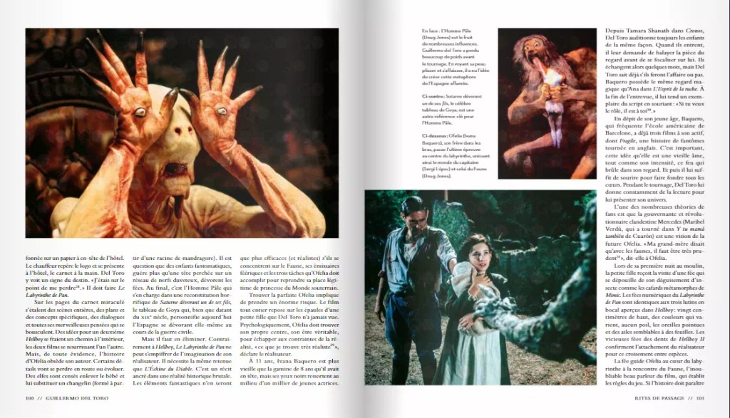 Ainsi, Ian Nathan nous plonge dans l’œuvre et l’esprit du génial réalisateur mexicain qui a réussi à créer un univers peuplé de fantômes, de contes de fées, de monstres et d’horreur fantastique. À travers la présentation chronologique de ses films, le livre nous fait vivre l’aventure cinématographique, heureusement encore inachevée, du magicien Guillermo del Toro. Du fin fond de son enfance rythmée par les séances de cinéma et le visionnage d’œuvres du cinéma B à ses débuts cinématographiques avec le culte Cronos et l’éprouvante expérience du tournage de Mimic, l’auteur invite le public à arpenter le labyrinthe baroque et tortueux de l’imagination du cinéaste de Guadalajara. Dans ce livre, del Toro se livre justement à cœur ouvert et nous fait part, non seulement de ses influences cinématographiques et artistiques qui l’ont poussé à devenir cinéaste, mais aussi de ses amours et traumatismes qui l’ont conduit à développer un style d’auteur de film remarqué et remarquable, totalement personnel et distinct de ses contemporain·e·s, y compris dans son pays dans lequel les films de del Toro y apparaissent comme autant d’objets étranges rendant sceptiques les institutions mexicaines au début de sa carrière.
