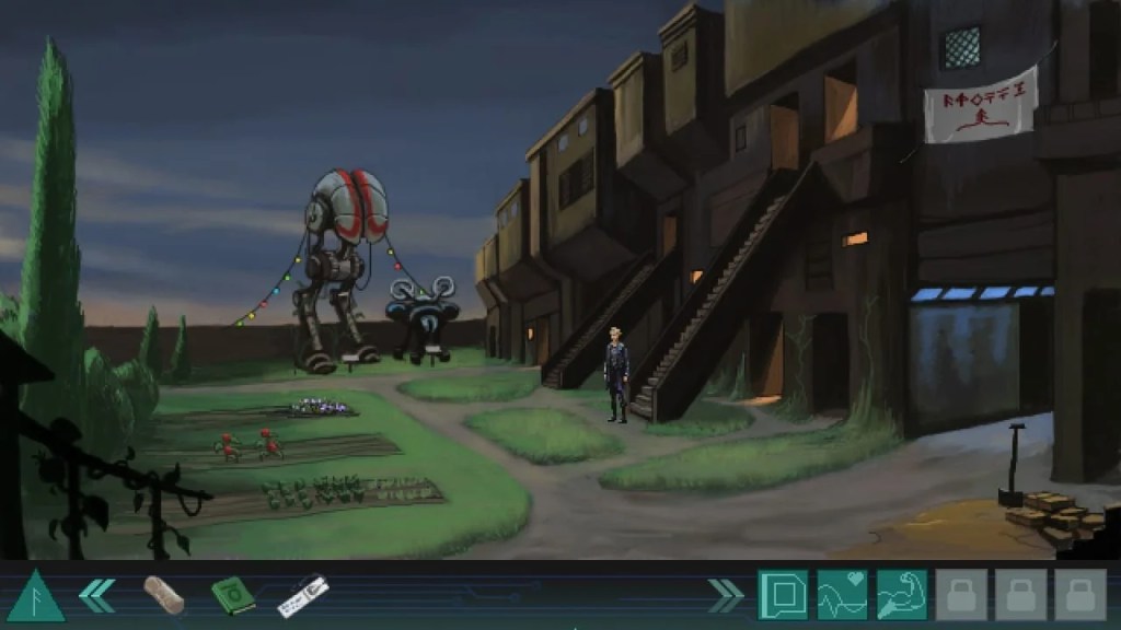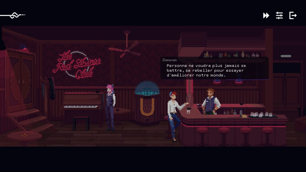 The Red Strings Club est un point & click d’aventure sous forme de thriller cyberpunk. Le récit nous transporte dans des enquêtes diverses, au travers de petits jeux forts sympathiques : fabrication d’implants, création de cocktails alcoolisés pour délier des langues, et orienter les conversations du bar jazzy, à l’allure ancienne, du nom de The Red Strings Club dans lequel Donovan, l’un des protagonistes principaux, est barman en plus d’être un résistant contre une mystérieuse corporation. L’histoire se déroule au sein d’une mégapole futuriste où des humain·e·s, des machines et des cyber-implanté·e·s tentent de survivre ou de se faire une place dans le monde. Entre réussite sociale, économique, domination et followers, les habitant·e·s de cette ville aussi colorée qu’oppressante se retrouvent dans ce pub venu du passé, en toute discrétion pour parler de ce qui cloche. De la peine de cœur à leur participation à quelques machinations d’industries en passant par certaines pensées révolutionnaires, les client·e·s du bar profitent du magnétisme de leur hôte pour s’exprimer à cœur ouvert. Avec des spiritueux de contrebande et autres alcools inconnus, Donovan possède cette capacité de mettre à l’aise et de faire parler. Très utile pour qui travaille dans la vente d’informations ! Ce jeu possède une esthétique pixel art très colorée, presque city pop, avec une pointe de complot technologique à déjouer, des choix parfois difficiles, et des confessions intimistes qui le rendent extrêmement prenant.