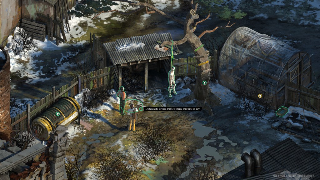 Ici, c’est une bataille politique qui fait rage dans un univers cyberpunk, entre cybernétisation et contexte ouvrier. Son design narratif fort et extrêmement développé offre un panel de possibilités assez impressionnant. Disco Elysium possède une écriture qui frôle la perfection composée par une équipe de huit écrivain·e·s. De son nom original, No Truce with the Furies, cette atmosphère est mise en valeur avec les musiques du groupe rock British Sea Power. Bien qu’il n’y ait pas de combats à proprement parler, c’est dans ses aventures textuelles que ce jeu estonien nous projette. Entre violences de propos fascistes, la montée de l’intolérance, une lutte sociale et un combat acharné contre la dépression qui pousse notre antihéros à consommer toute sorte de substance lui anesthésiant le cerveau, le monde de Disco Elysium se caractérise par la misère, la folie et les rumeurs de cette ville de Révachol dont le passé douloureux hante encore l’esprit de ses habitant·e·s. Anciennement sanctionnée par une coalition internationale pour avoir tenté de former un gouvernement révolutionnaire 40 ans plus tôt, cette ville se remet doucement de la purge et du massacre perpétrés au sein du quartier de la Martinaise, un secteur dans lequel les communistes et les syndicalistes gardent un certain crédit face aux ultralibéraux, intolérants, intéressés et gangrénés par des idées racistes.
