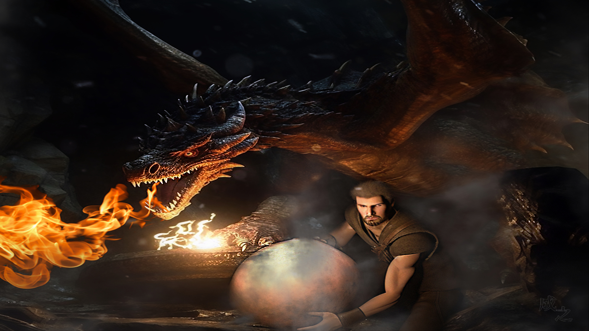 À genoux, le dos ruisselant de sang, son armure calcinée à ses pieds et l’œuf de dragon toujours en main, Ewart savoura un instant la chance qu’il avait d’être toujours en vie. Un instant seulement. Car des tréfonds de la caverne, la voix du dragon retentit telle une menace céleste.