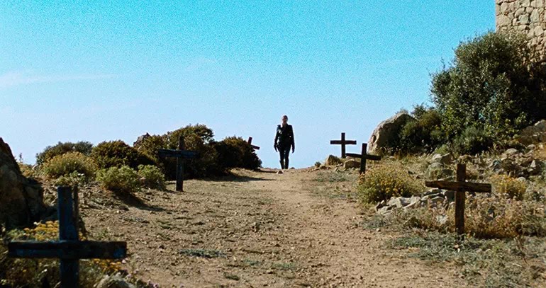 Dans leurs deux premiers films, les cinéastes se bornaient avec un talent immense à déclamer leur amour du giallo, démarche dont iels avaient finalement fait le tour avec L’Étrange Couleur des larmes de ton corps. Loin de s’en éloigner avec Laissez bronzer les cadavres, iels le fusionnent ici avec des éléments clairement hérités du western italien. Soleil aveuglant, gros plans sur les regards, armes à feu, compositions à la Leone, les exemples sont nombreux et, associés aux codes du giallo constitué notamment de cuir et de sang, aboutissent à un résultat remarquablement homogène, comme si ces deux genres avaient été faits pour se rencontrer. L’ADN italien du métrage transpire ainsi de chaque photogramme, le public se retrouvant 1h 30 durant sous perfusion transalpine, respirant, expirant et suintant le cinéma de genre italien.