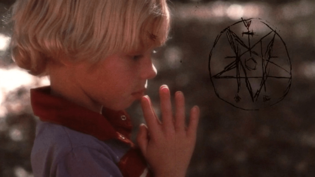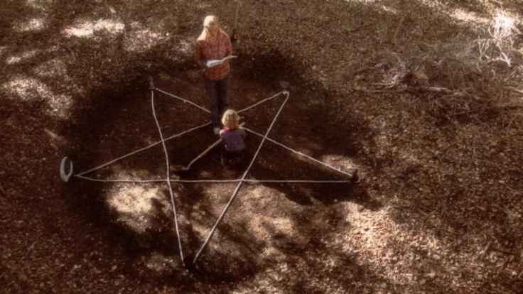 Entre les séquences de promenade, l’objectif assez mignon des deux enfants et l’apparition soudaine des symboles ésotériques à l’écran, Antrum regorge de trucs bizarres. Le jeune Nathan fait des cauchemars depuis que sa mère lui a dit que sa chienne Maxine n’est pas allée au paradis mais en enfer parce que c’était un « mauvais chien », sa sœur Oralee décide alors de l’emmener dans des bois réputés hantés, un endroit lugubre où les gens du coin viennent pour se suicider. Ayant préparé une petite histoire, une sorte de grimoire et le nécessaire pour camper, elle fait croire à son frère qu’il est possible de creuser un trou vers l’enfer afin de libérer le chien de sa damnation éternelle. Avec un carnet de notes dans lequel sont gribouillés des symboles magiques et l’envie d’aider (ou de traumatiser ?) son frère, Oralee lui fait réaliser d’étranges sorts et rituels et creuser un trou afin de retrouver le collier de Maxine – un signe que la chienne aurait été libérée de l’emprise de Satan… Contre toute attente, la jeune fille se rend compte que ces rites semblent avoir un effet pour de vrai ! La suite du récit se poursuit avec l’apparition d’entités infernales et la rencontre d’un duo de rednecks cannibales, la fiction inventée par Oralee se confond de plus en plus avec la réalité comme le fait sentir ce faux documentaire à son public…