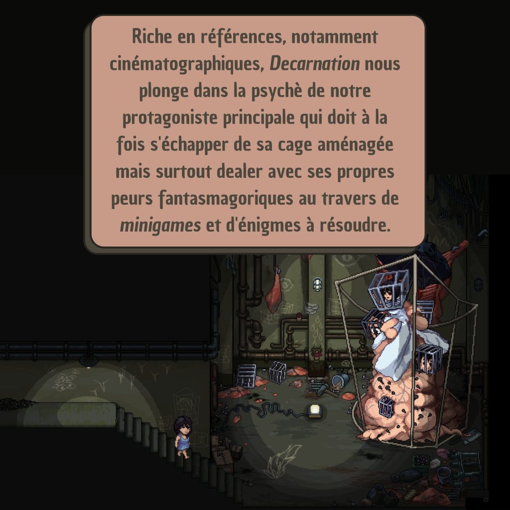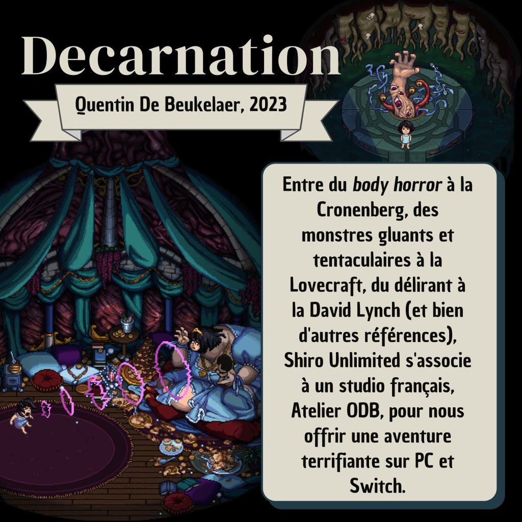 Entre énigmes sinistres, clins d’œil au cinéma de genre, et tranches de vie, Decarnation est une petite perle d’une horreur mondialisée aux multiples références culturelles, aux folklores des quatre coins du monde, mettant en avant les origines de la terreur : la peur, les conflits psychiques et les blocages face à la violence de ce monde. Véritable catharsis et bel hommage à l’horreur sous toutes ses formes, ce jeu vidéo s’attarde davantage sur le monde intérieur de son héroïne et sa lutte acharnée contre ses pensées destructrices que sur l’enfermement concret dont elle est victime. Decarnation est disponible sur Steam et sur Nintendo Shop !