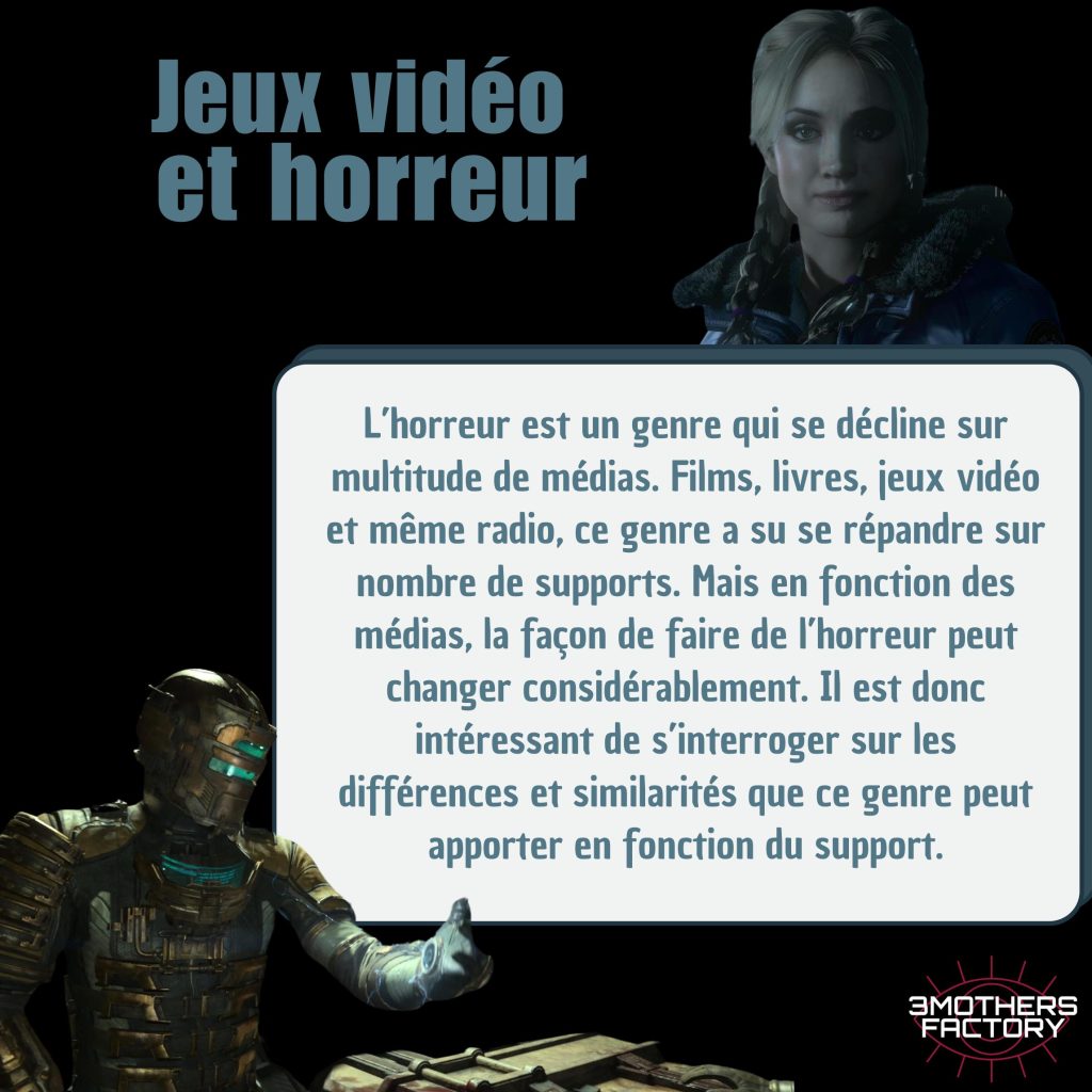 L’horreur est un genre qui se décline sur multitude de médias. Films, livres, jeux vidéo et même radio, ce genre a su se répandre sur nombre de supports. Mais en fonction des médias, la façon de faire de l’horreur peut changer considérablement. Il est donc intéressant de s’interroger sur les différences et similarités que ce genre peut apporter en fonction du support.