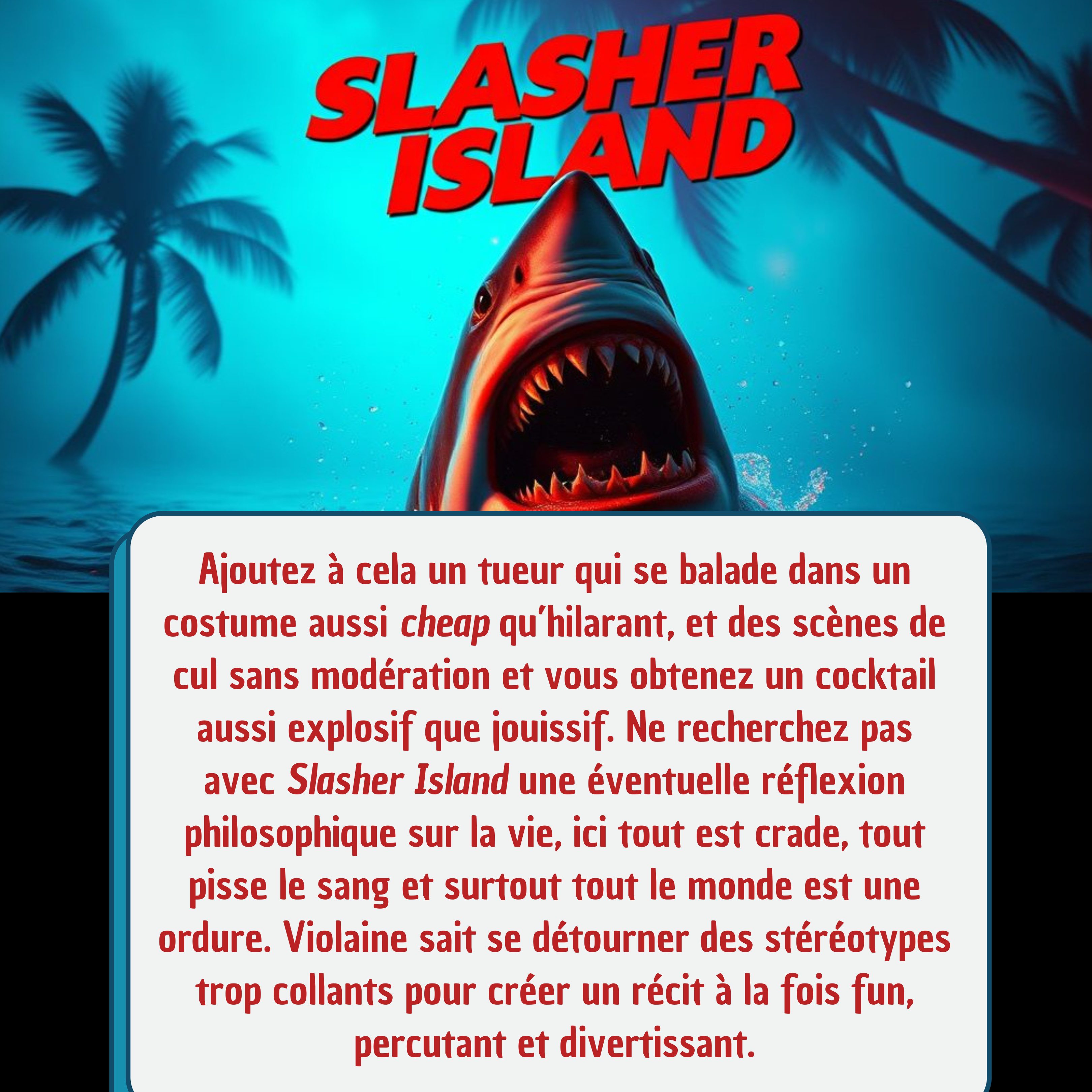 Toutefois mon attention se porta sur une couverture à la douce couleur bleu cyan. Dessus, un requin qui va bouffer une nana, bon je n’aime pas trop les histoires des requins, ça me fait chier. Cependant le titre ne me laisse pas indifférent, Slasher Island en voilà un beau titre. J’aime les slashers, j’aime les islands, c’est parfait pour moi. La très sympathique Violaine me promet du gore, du cul (pas avec moi cependant, calmez-vous), et du fun à gogo. Franchement j’adhère, j’ai besoin de décomplexer de mes lectures trop académiques, il me faut un livre qui sent l’été et qui me raconte une histoire légère et bien sanglante.