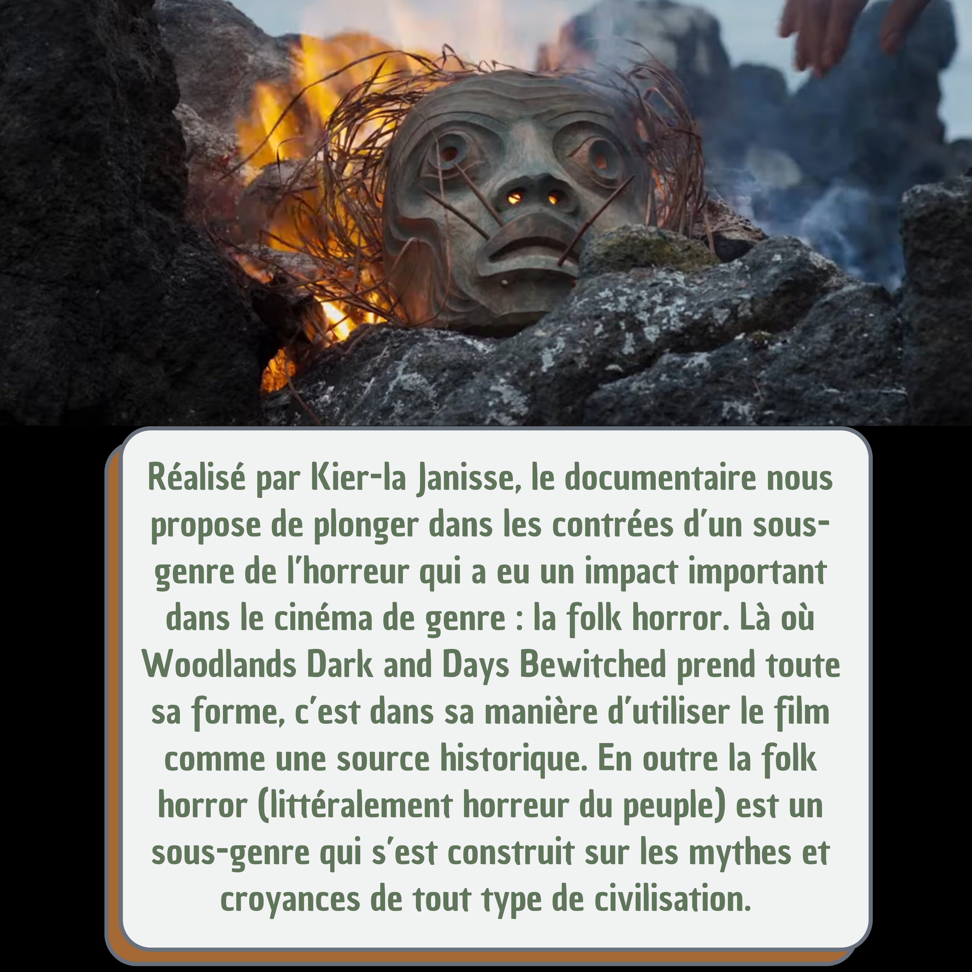 Woodlands Dark and Days Bewitched est ainsi un documentaire complet, très bien sourcé qui développe une réflexion quasiment universitaire sur la folk horror, on espère ainsi que cette réalisation permettra à de nombreux spectateurs et de nombreuses spectatrices de découvrir plus en profondeur ce sous-genre horrifique parfois mis de côté, ou contesté.