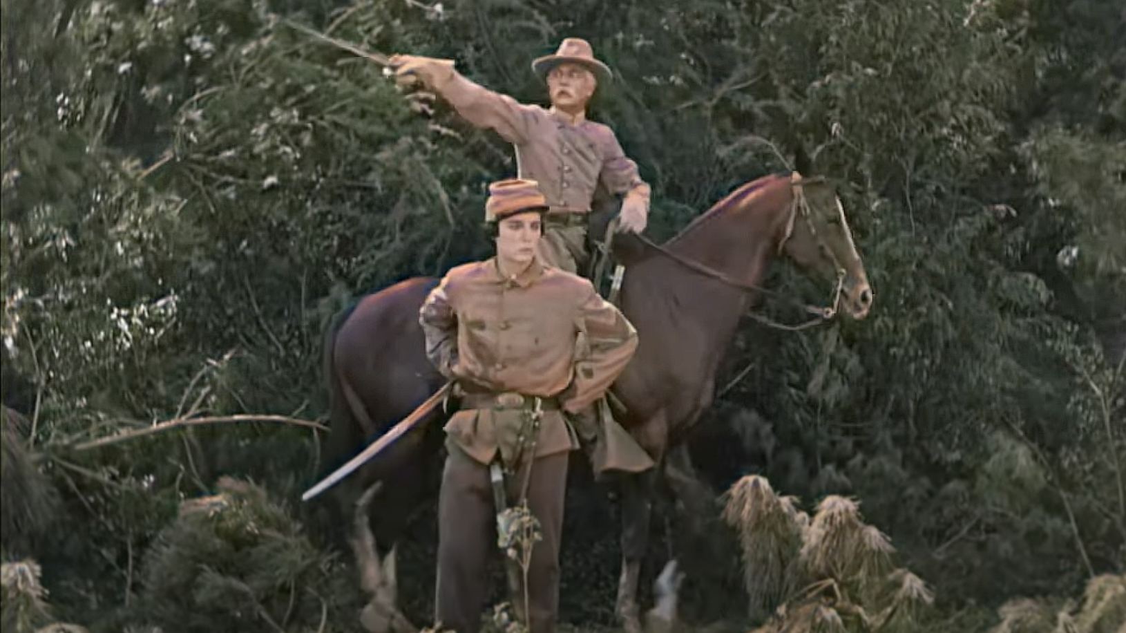À 1h08min20sec, après un jeu du chat et de la souris mêlant cascades, péripéties et séquences complexes de course poursuite entre locomotives rivales (le lacis des rails et les jeux d’aiguillage comme figure symbolique des destinées mortellement entrecroisées des deux belligérants), la « General » (avec la fiancée à l’intérieur) est enfin ramenée avec succès côté sudiste et la « Texas », dans un séquence devenue culte, réalisée en conditions réelles, s’anéantit du haut d’un pont saboté en sombrant dans l’eau.